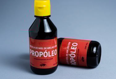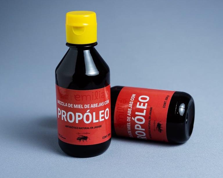 Mezcla natural de miel de abejas y propóleo, reconocida por sus propiedades medicinales y su sabor intenso. Este es un potente antibiótico natural en jarabe, elaborado con ingredientes puros y sin aditivos, solo miel de abejas y propóleo. Este producto fue envasado con altos estándares de calidad y representa nuestro compromiso con el bienestar, la tradición apícola y la medicina natural.