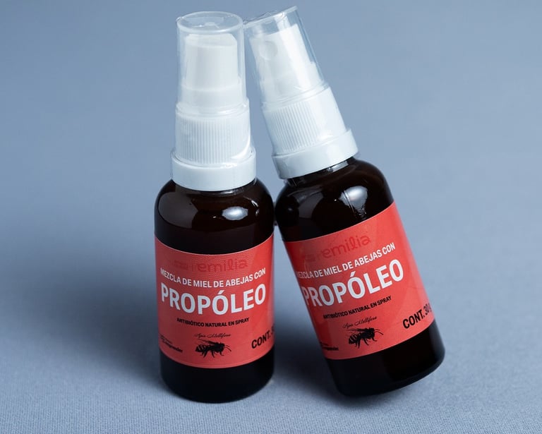 Disfruta de todas las bondades y beneficios del propóleo como antibiótico natural, alimento y compuesto para aliviar síntomas de la gripe. Presentación en jarabe, spray para llevar siempre contigo y en gotero para uso tópico aplicando en la zona afectada.